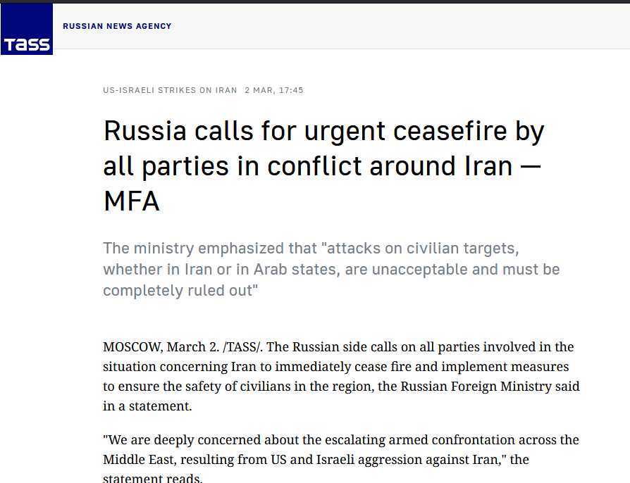 On the 28th of February and in the midth of negotiations between the USA and Iran, the USA and Israel launched an unprovoked war of aggression against Iran murdering the Iranian supreme leader, the top religious and advisory figure in the country, along with his family and several top Iranian officials who were studying the negotiations outcome, and simultaneously bombed an elementary school in southern Iran slaughtering 170 little schoolgirls and their teachers, a second heinous stab in the back within 8 months by the same parties committing the genocide in Gaza, and within three days, the Russians want a ceasefire, mind you, an unconditional ceasefire.